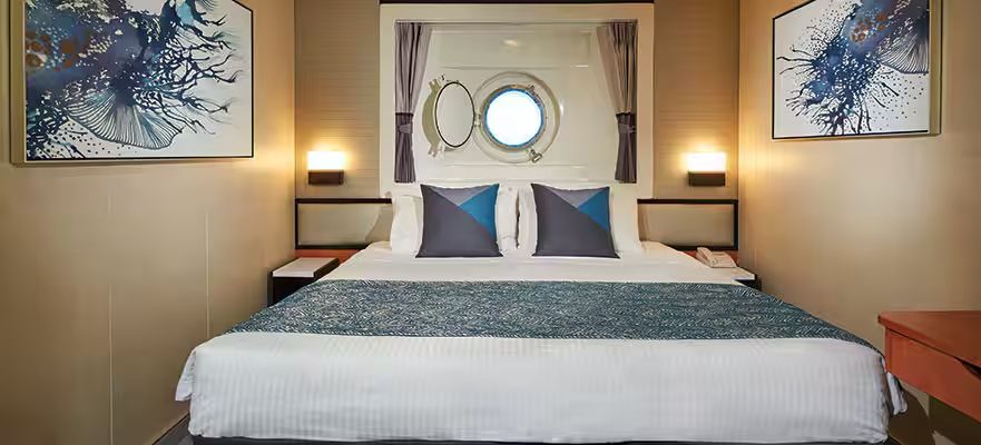 These ocean view staterooms have a maximum capacity of four guests. Includes two lower beds that convert to a queen bed, extra beds for two more people, and a porthole to enjoy the view. Some are interconnected so you can have your personal space while still being with your group.
